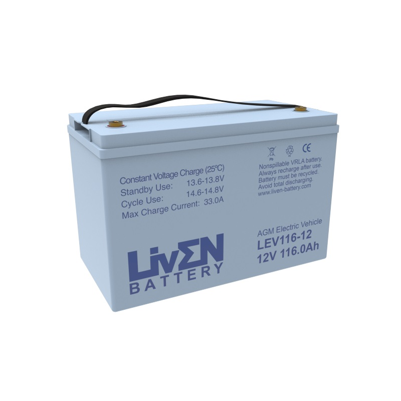 La batería LIVEN LEV116-12 AGM Ciclica se ha desarrollado con una rejilla y un material activo específicos. Esta batería contiene placas y una caja en polipropileno que resiste fuertes impactos. Además, ha sido especialmente diseñada para aplicaciones de ciclo profundo de descarga frecuente (Vehículos Eléctricos).