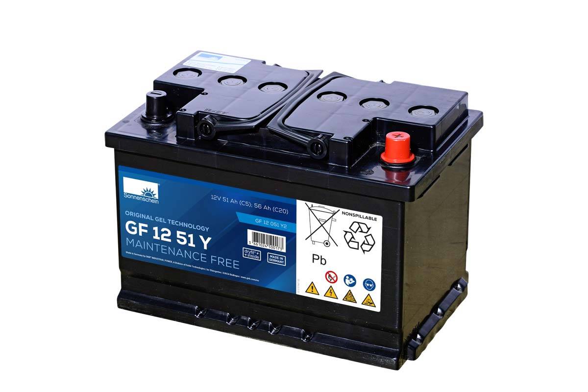 La batería SONNENSCHEIN GF12051Y2 GEL Cíclica está diseñada para su uso en aplicaciones cíclicas y no requiere relleno de agua durante toda su vida en servicio. Las baterías GF-Y están especialmente indicadas para el mercado del ocio y la movilidad (sillas de ruedas, scooters, carritos de golf y barcos eléctricos).